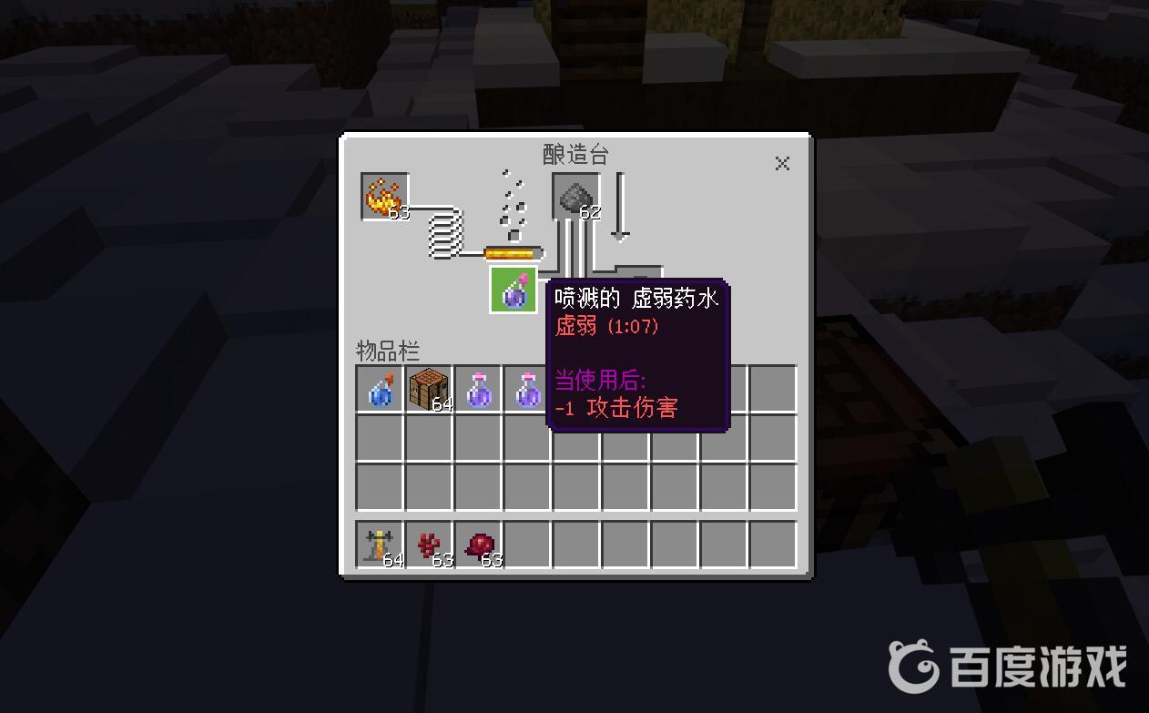 首頁 我的世界 問答 我的世界噴濺型虛弱葯水的配方怎麼做? 2022-12-30 找到釀造台,分別放入地獄疣,發酵蛛眼和火藥即可合成。1,首先我們進入釀造台,如圖依次放置烈焰粉,地獄疣和水瓶。2,接著放入發酵蛛眼。3,最後放入火藥,就可以合成噴濺型虛弱葯水了。