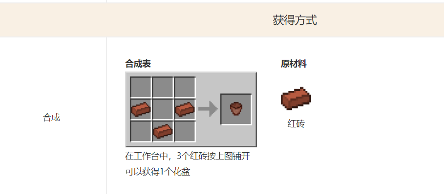 在工作台中,3個紅磚按下圖鋪開就可以獲得1個花盆。在我的世界中,花盆為可以放置樹苗、蘑菇、花、仙人掌、蕨與枯死的灌木的裝飾性方塊。