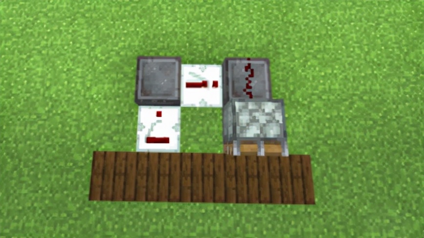 5、在最底部的普通方塊旁邊放置紅石中繼器,並按照圖中方式放上紅石。