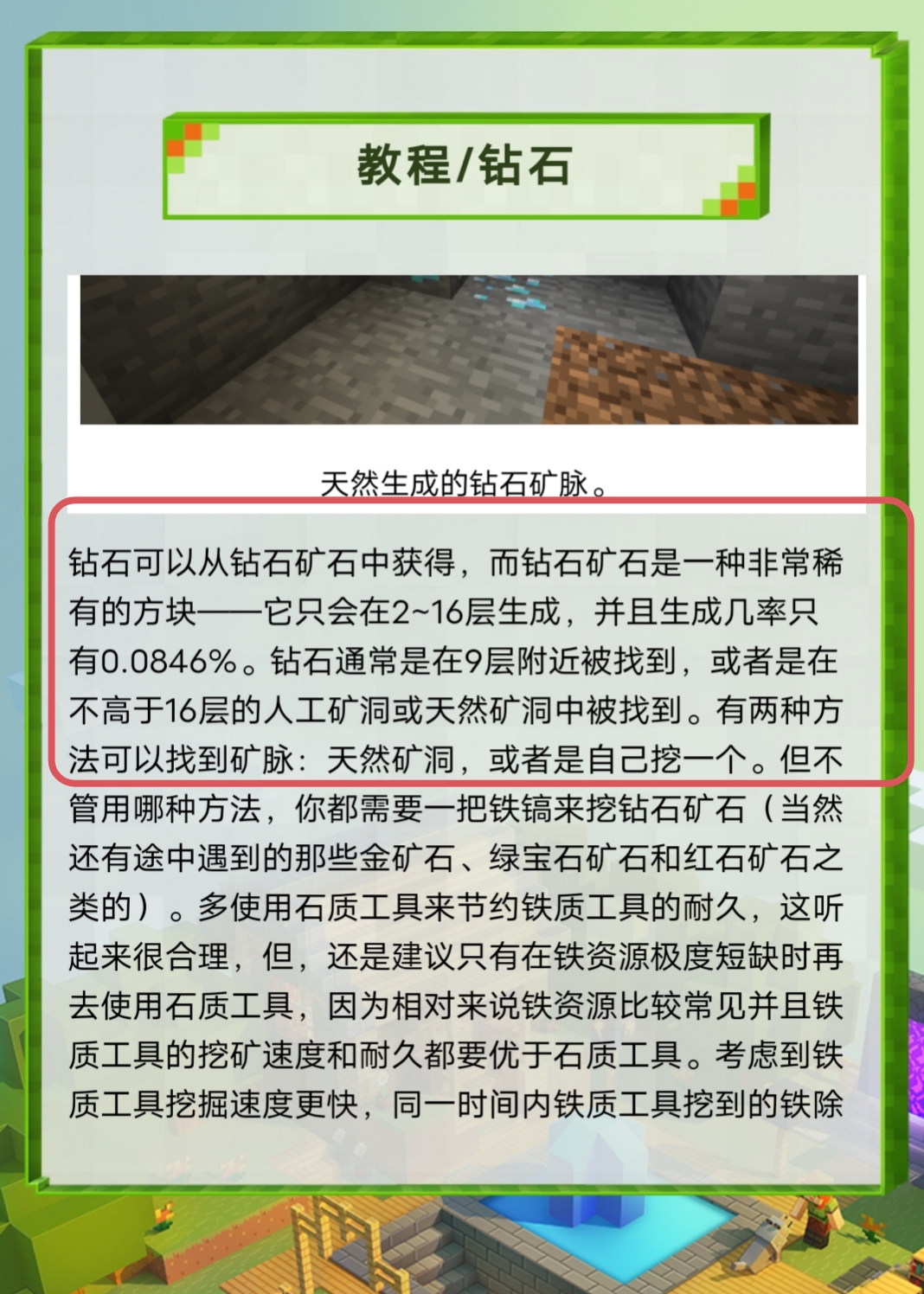 首頁 我的世界 問答 我的世界1.19版本鑽石一般在多少層? 2022-12-30 鑽石礦石是一種非常稀有的方塊——它只會在2~16層生成,並且生成幾率只有0.0846%。鑽石通常是在9層附近被找到,或者是在不高於16層的人工礦洞或天然礦洞中被找到,可以在天然礦洞裡面找到。