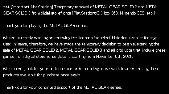 Konami發表公告宣布從即日起暫時在全平台數字商店裡下架《合金裝備2》和《合金裝備3》,原因是游戲中使用的檔案素材使用許可權到期,目前官方正在著手解決該問題。