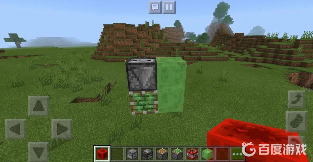 2、轟炸機的尾部搭法:製作轟炸機的尾部,需要放置一個紅石塊,但是要清楚,紅石塊在搭建的時候是不用放置的,它只有啟動的時候才會被加上去。一個向後的發射器,一個向前的普通活塞,用粘液塊連接二者,尾部就完成了。
