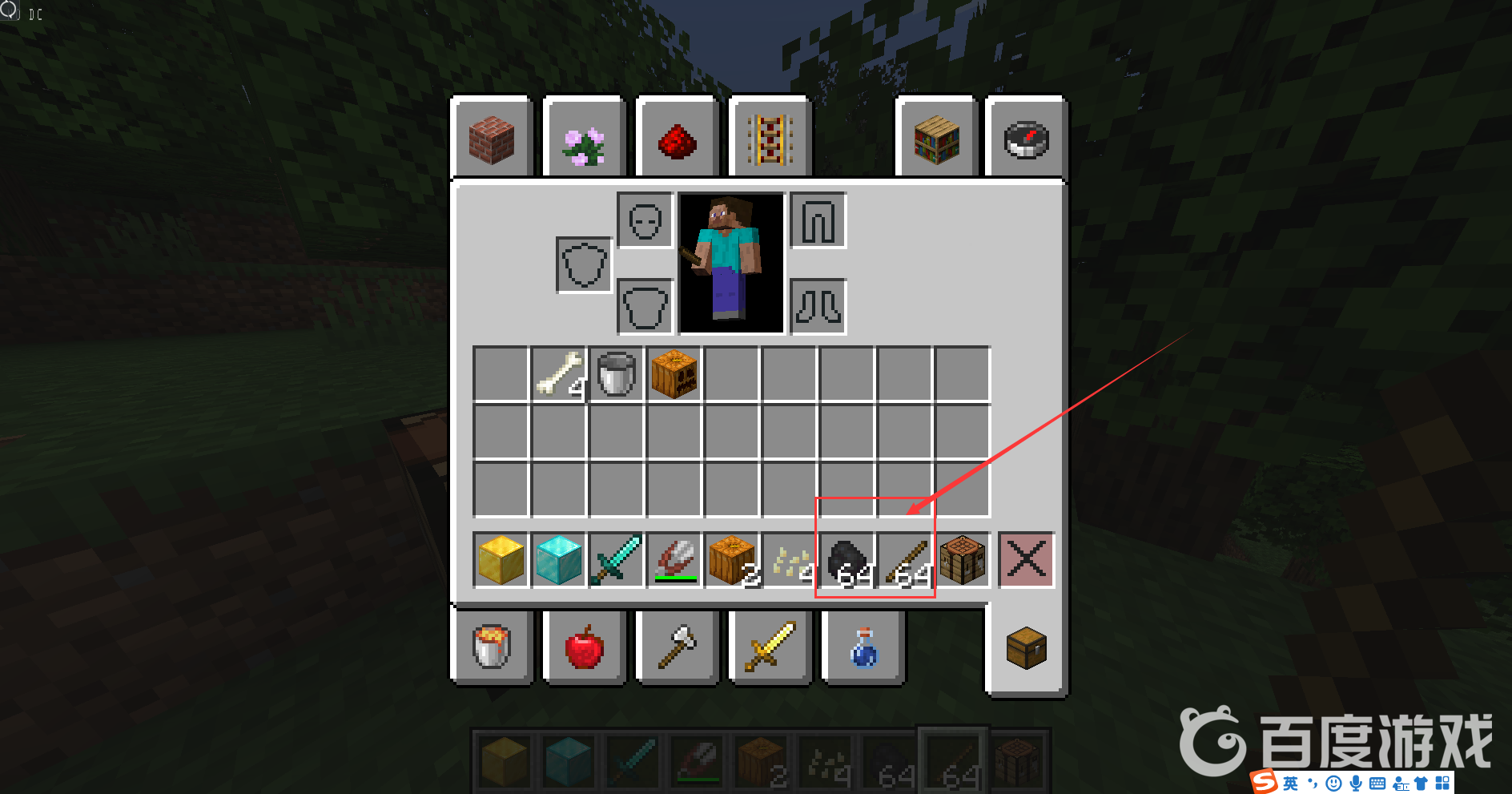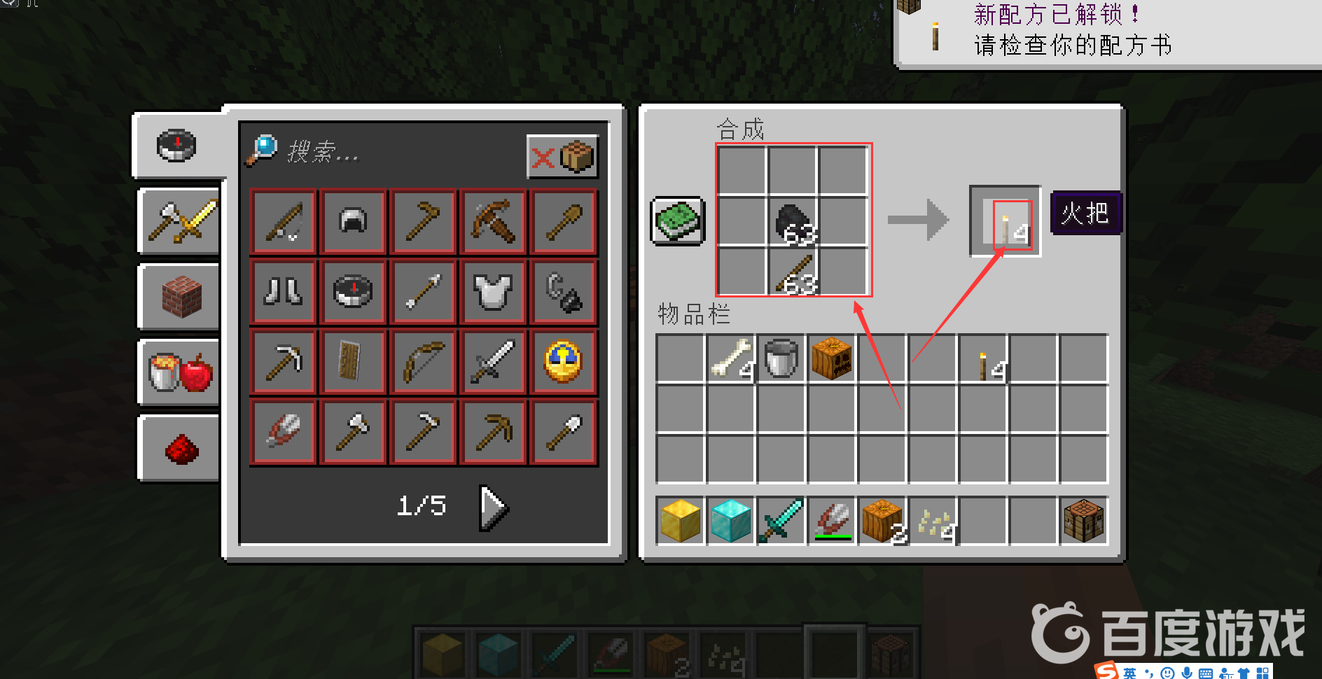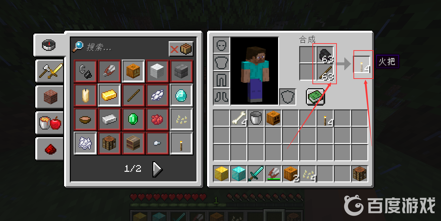 首頁 我的世界 問答 我的世界火把為什麼做不了了? 2022-12-30 【我的世界】做不出火把可能是由於材料使用錯誤,或是製作地點錯誤。火把需要木棍跟煤炭來合成:玩家打開背包後,將煤炭跟木棍一次排列下去,如圖:也可以在工作台製作,每一個木棍加一個煤炭可以獲得4個火把: