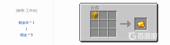 粗金作用為合成粗金塊,9粗金可合成1粗金塊。可以通過挖掘金礦石或深層金礦石獲得粗金,另外使用帶有時運附魔的工具可以增加掉落數量。