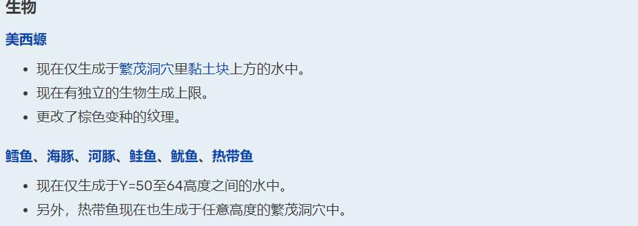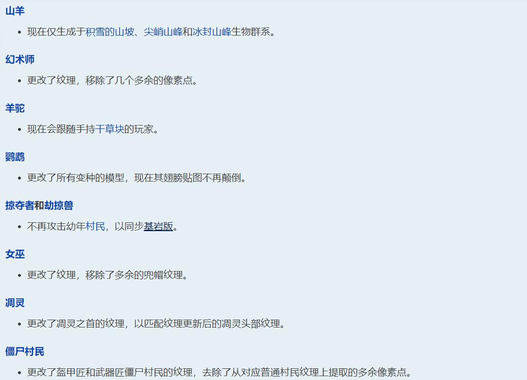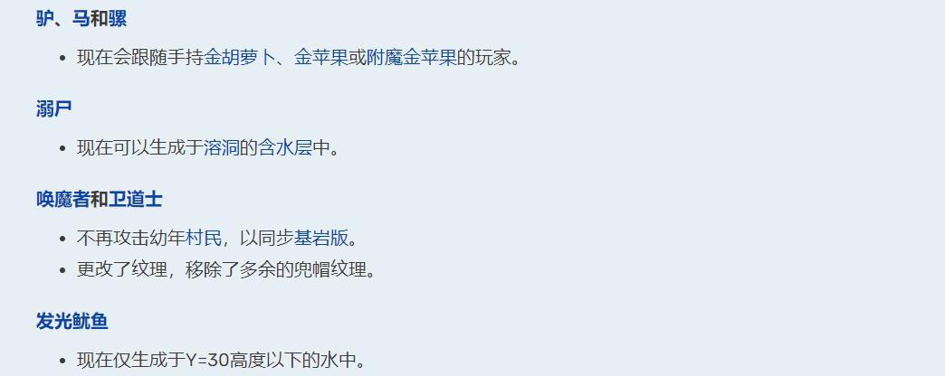 首頁 我的世界 問答 我的世界118更新了什麼生物? 2022-12-30 1、在1.18版本中,我的世界對生物有所更新。首先是水生生物。如美西螈、鱈魚、海豚、河豚、鮭魚、魷魚、熱帶魚等。2、別的生物,如驢、馬和騾;溺屍;喚魔者和衛道士;發光魷魚。3、又如:山羊、羊駝、殭屍村民等。
