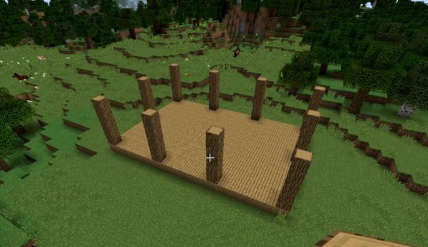 2、沿著邊緣每隔五格搭一根五格高的原木柱子(順便說一下,這個建築除了屋頂都是橡木的)。