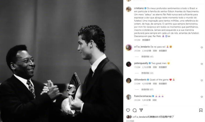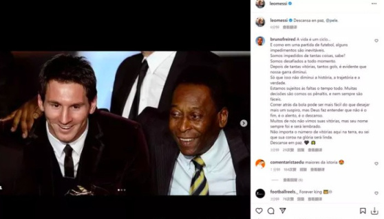 阿根廷球星梅西、葡萄牙球星C羅等人在社交媒體上發布了悼念貝利的信息,梅西在社交媒體上貼出了自己與貝利的合影舊照,並稱,「安息吧,貝利」。