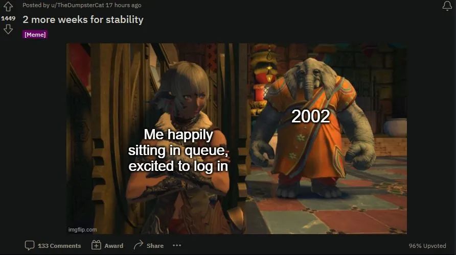 不過,玩家還是會遇到一些問題。在論壇 Reddit 《最終幻想14》分區中,許多玩家都發表了有關「錯誤代碼 2002」相關的梗圖和表情包。事實上的排隊時間主要取決於伺服器人數和玩家是付費還是免費玩家。