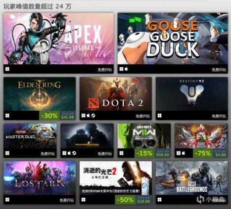 買斷制游戲中,《艾爾登法環》、《消逝的光芒2》、《怪物獵人:崛起》、《永劫無間》和《使命召喚:現代戰爭2》紛紛上榜,其餘則都是本體免費的網游。