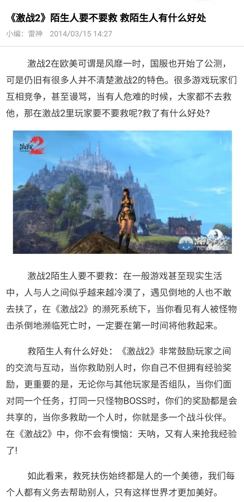 《激戰2》瀕血倒地的玩家,可以高喊一句「救命」,如有路人經過,拉你復活,屏幕就顯示「一名高貴的靈魂正在幫助你!」,令人不禁想表示感謝。而救人是有經驗值獎勵的,就連「小編」們也強烈推薦,一定要第一時間把人救起來。