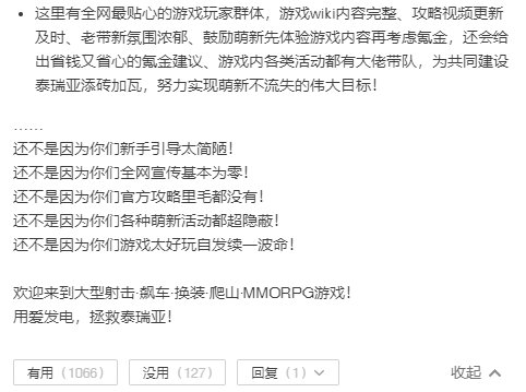 在WeGame評論區,已經有玩家自發地安利這款遊戲。其中,被頂得最高的評論有幾句口號:「用愛發電,拯救泰瑞亞」,「努力實現萌新不流失」,還吐槽了《激戰2》的種種缺點。