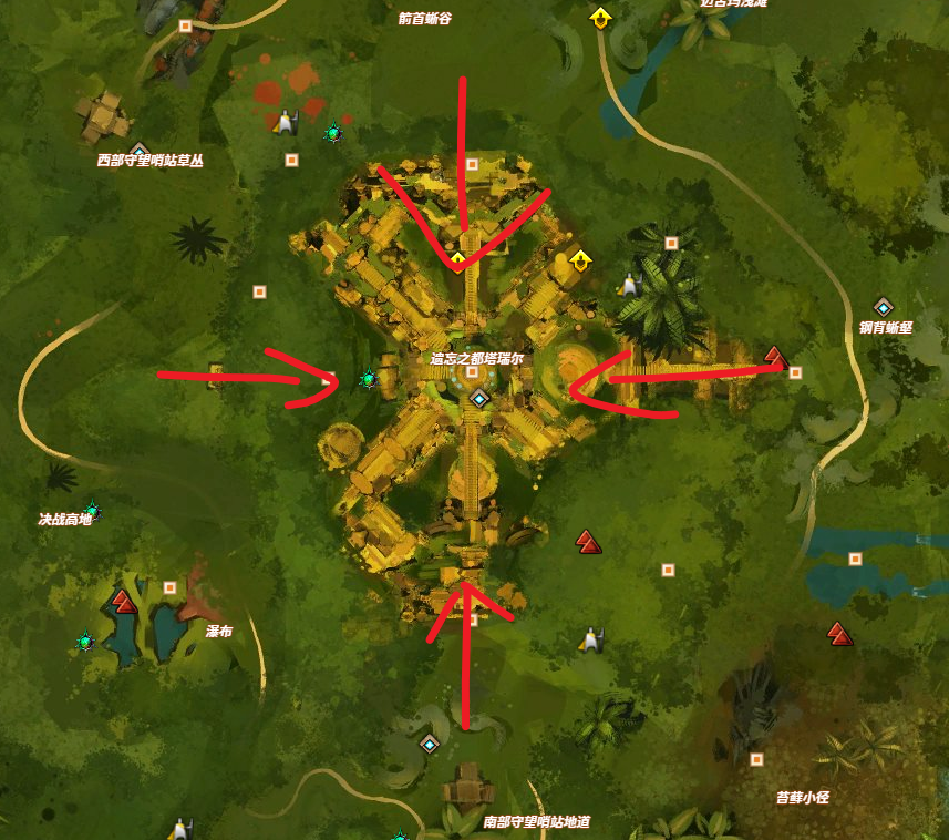 《激戰2》的創新在於,遊戲沒有止步於地圖難度,而是將地圖設計,與遊戲核心的動態事件結合了起來。以邁古瑪腹地某張地圖的大型事件「四門」為例,這一事件每隔兩小時發生,需要同地圖玩家攻打四扇大門。