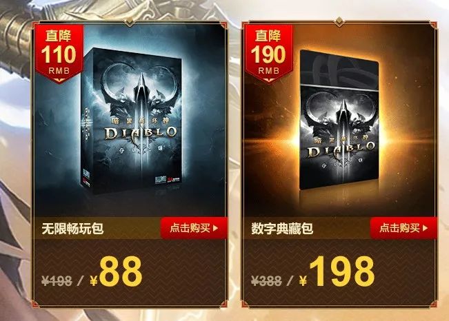 《暗黑破壞神III》暢玩包優惠價88元(原價198元),典藏包優惠價198元(原價388元),升級包優惠價110元(原價190元),「死靈再世」內容包優惠價45元(原價88元)。