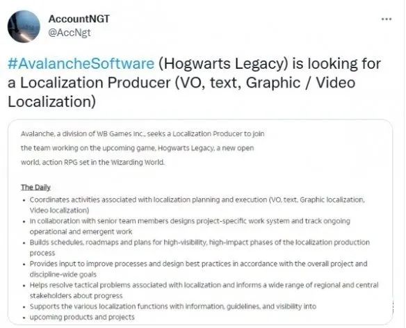 來自推特的知名爆料者AccountNGT稱《霍格沃茲:遺產》開發商目前正在招募本地化工作人員,本地化工作往往是實際開發中的最後階段。爆料者還稱,一家名為 Sumo Digital 的工作室目前正協助開發,所以《霍格沃茲:遺產》將會比預期更快的完成。