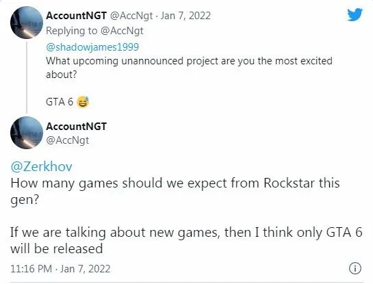 遊戲業內人士AccountNGT是知名的爆料者,他在回復玩家問題時說:「R星將推出幾款遊戲?如果我們說的是新遊戲,那麼我認為只有《GTA6》會發布。」