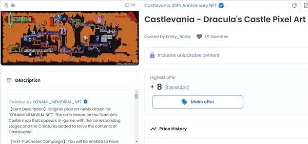為紀念《惡魔城》系列問世35周年,科樂美舉辦了《惡魔城》數字藝術品的拍賣會,拍賣了14件基於經典《惡魔城》的NFT商品,每件NFT藝術品的平均價格約為1.2萬美元,其中售價最高的是《惡魔城》德古拉城堡地圖的藝術品,售價為26680.24美元,總銷售金額超過16.2萬美元。