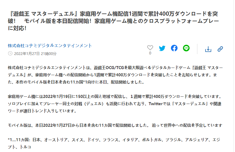 Konami於昨晚(1月27日)宣布線上卡牌遊戲《遊戲王:大師決鬥》在家用遊戲機平台((PlayStation®5、PlayStation®4、Xbox Series X/ S、Xbox One、Nintendo Switch、Steam))一周內下載量超400萬次。