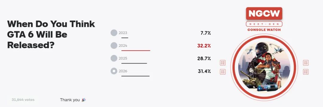 看起來大部分玩家對《GTA6》近期發售不抱有任何希望。根據投票,大多數玩家認為是2024年,此外投2025年和2026年的玩家也非常多。