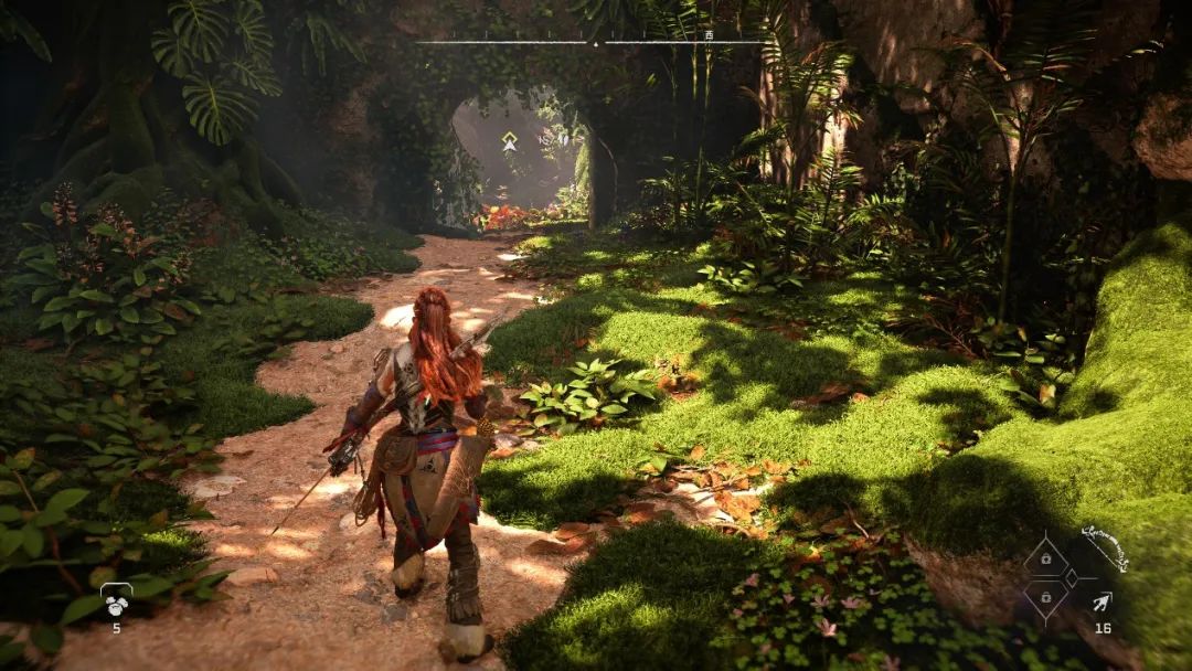 從畫面表現來說,《西之絕境》當之無愧是目前的第一梯隊,這在剛進入游戲的時候你就能感受到。游戲刻意將故事開場放在植被非常多樣且茂盛的叢林中,讓玩家在初見面的時候就對材質特效和紋理細節留下深刻的印象。甚至,游戲因為場景細節的暴增而呈現出了一種微妙的「銳化過度」感,不過在後期場景開闊後,這樣的感覺也隨之消失了。