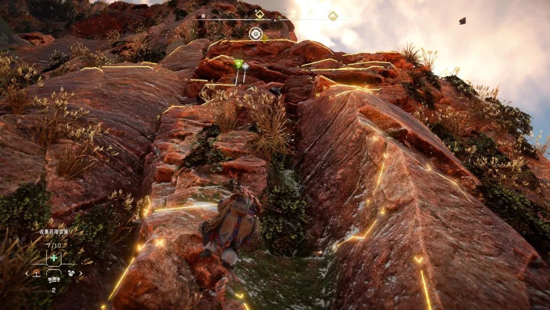 相比邊際效應逐年遞減的畫質提升,沉浸感和體驗方面的優化反而是《西之絕境》在體驗感知上更為明顯的改進。在大多數攀爬游戲里,攀爬點會以明顯與其他岩石不同的方式做重點標記,有時候這會嚴重影響代入感,但在《西之絕境》中,岩石的攀爬點幾乎全都被隱去,需要玩家使用Focus的掃描功能,才會用黃色標記清晰地表現出攀爬部分,是畫面觀感和游戲體驗上的雙向改良。