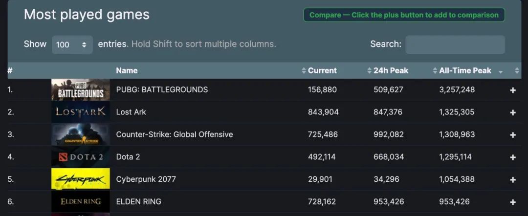 Steam在線遊玩人數峰值排行前十: