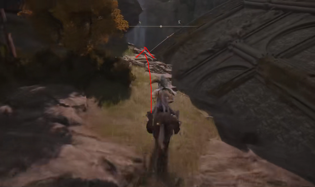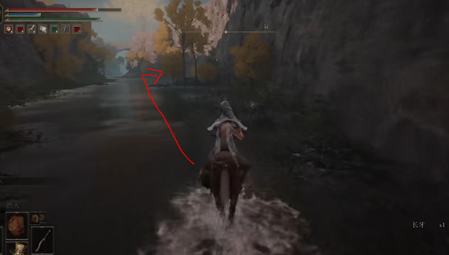 2、然後騎上馬往後面箭頭所指的地方跳下去,往後跳會掉一些血,從前面跳必s,下面還有一把武器可以撿