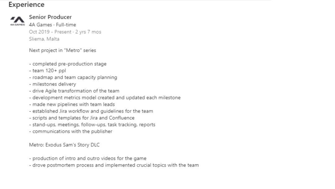 根據4A Games高級製作人Timur Suzi的領英簡歷,4A Games目前有超過120人正在開發《地鐵》新作。簡歷提到他本人是從2019年10月到至今擔任高級製作人,這意味著《地鐵》新作至少已經開發了2年7個月。