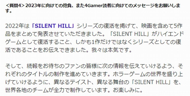 岡本基說:「2022年是《寂靜嶺》系列復活的開端,我們公布了包括電影在內的五部《寂靜嶺》作品。我們向粉絲承諾,隨著《寂靜嶺》高品質游戲的啟動,《寂靜嶺》系列也將迎來復興,並且不只是游戲,而是整個系列。我們是認真的!」