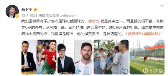 聶佬銳評,「我們圍棋界有不少喜歡足球和愛踢球的,古力就是其中之一,而且踢的很不錯,有棋界C羅的外號。從風格上說,古力的棋也是力量型的,跟C羅還真的挺像。如果要在圍棋界找個梅西的話,我覺得是柯潔,他的棋更靈活,是技巧型的。」