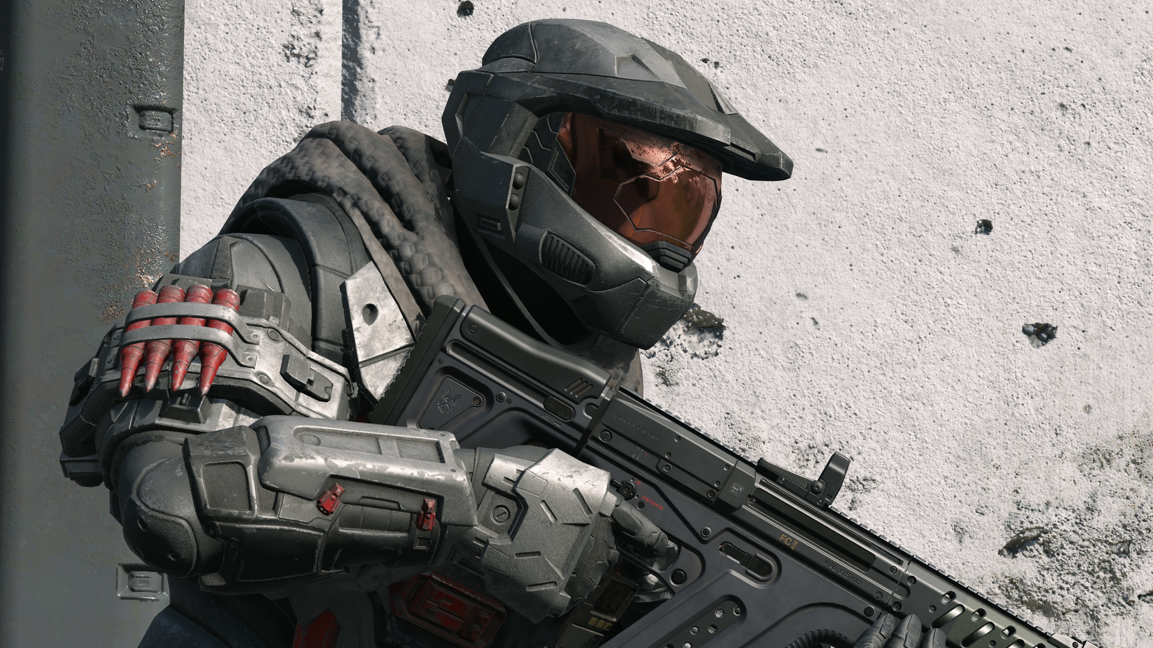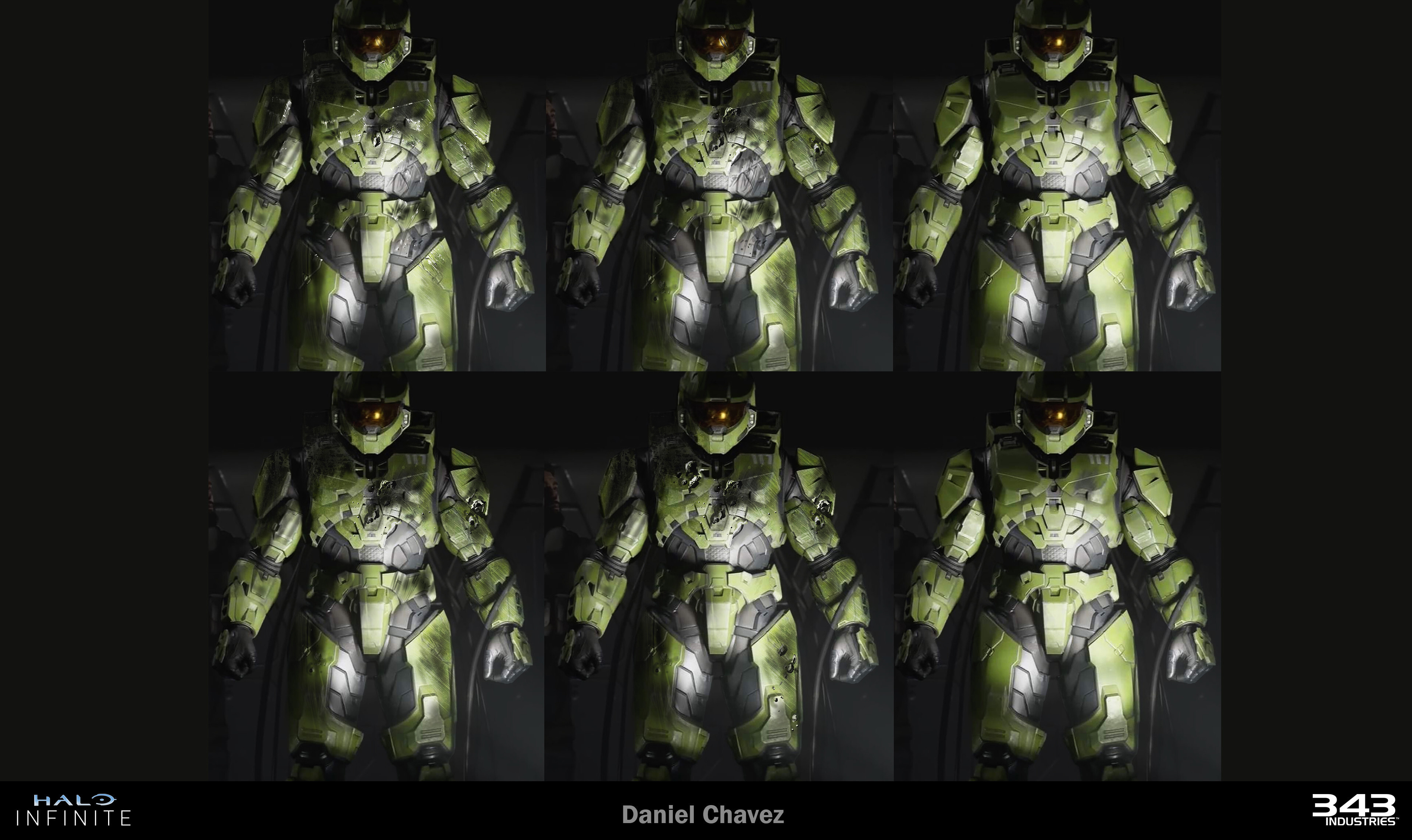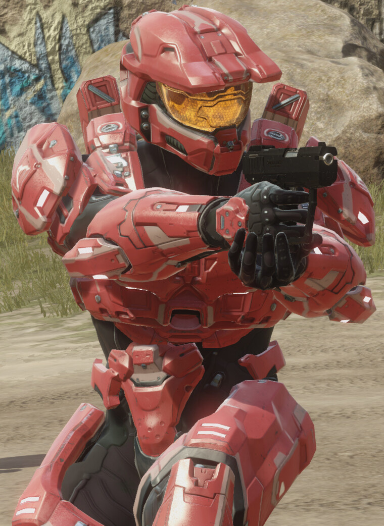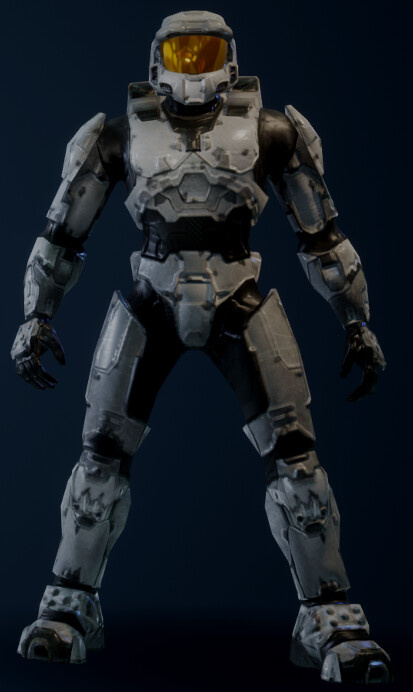 士官長在光環5中穿戴的護甲和光環4大致相同,只是有一些細微的外觀更新。面甲從暗淡的橙色變為充滿活力的金色。先前胸甲上的傷痕現在沒有。手臂和上身的內襯具有蛇皮質地。