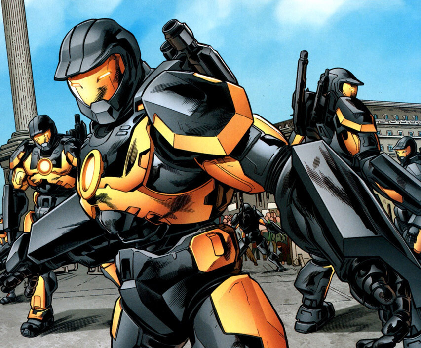 漫威漫畫《終極宇宙》中的Operation Firepower穿戴的護甲和Mark VI非常相似,並結合了鋼鐵俠盔甲的元素。其頭盔與Mark VI幾乎相同,都有橙色的面甲,但是有鋼鐵俠特色的眼縫