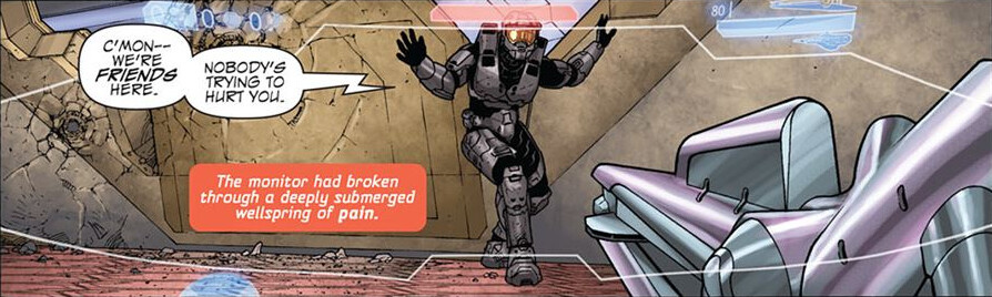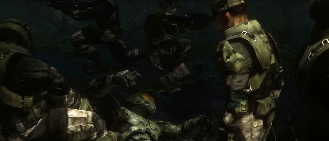 宣教士蘇醒並摧毀安魂星的核心後,士官長墜落到了岩石峽谷地形中,堅固的護甲替士官長擋下了鈍力創傷,且護甲和士官長無明顯損傷,只是短暫昏迷。