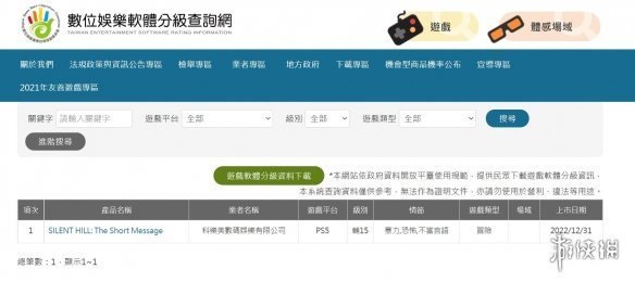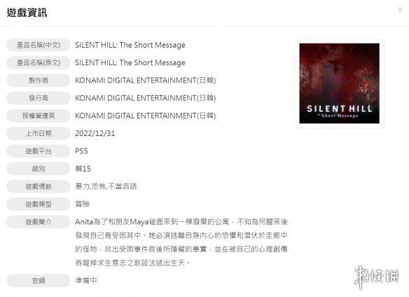 目前可以在台灣「數位娛樂軟體分級查詢網」上搜索到《寂靜嶺:短消息》的更多介紹內容,其中不僅顯示了該遊戲的開發商、發行商、分級信息,還有這款遊戲的劇情簡介和封面圖片。