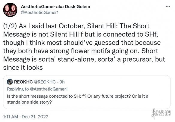 爆料人Dusk Golem表示,《寂靜嶺:短消息》正是他在幾個月前透露的代號為「櫻花」的寂靜嶺新作,它不是科樂美正式公開的《寂靜嶺f》,不過二者之間存在一些聯系。