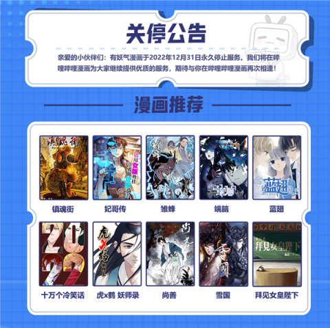有妖氣漫畫正式關停,而且是永久性停止服務,相關漫畫服務並入B站。目前,有妖氣官方網站只剩下了一則關停公告,以及指向B站的漫畫推薦: