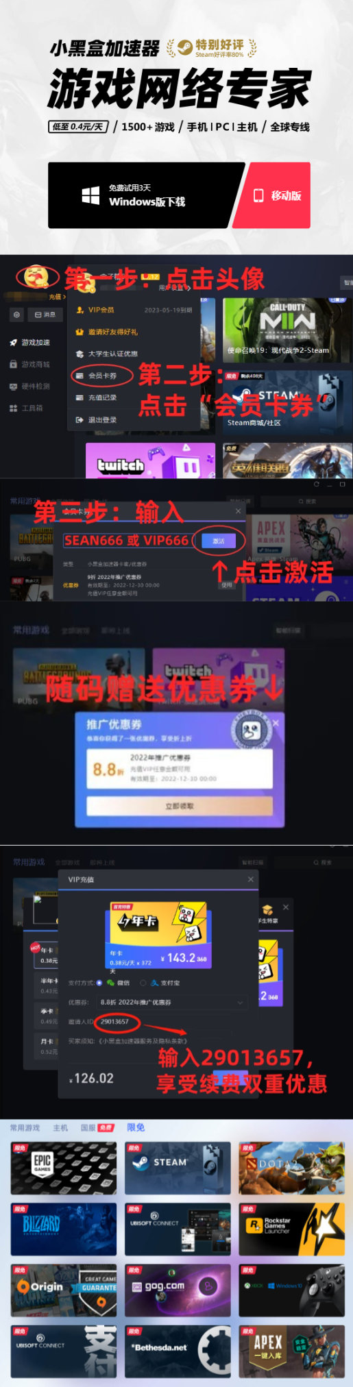 小黑盒加速器免費時長:SEAN666,Epic、Steam 無法登陸,頁面卡頓,就用它!使命戰區PUBG吃雞APEX專屬線路,支持1500+ 遊戲!激活步驟:充值→會員卡券→輸入「SEAN666" 或 「VIP666」,告別高延遲,暢玩海外遊戲!