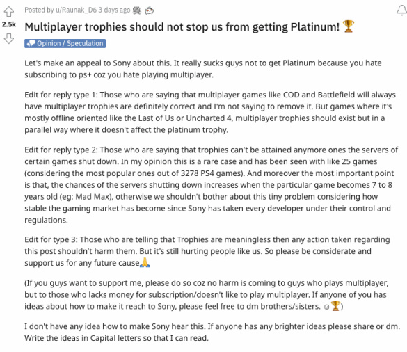 玩家表示:像《COD》、《戰地》這種遊戲,有多人獎杯是沒問題的,自己的意思並不是要刪除它們。但是像《神秘海域4》、《最後生還者》這種以單人劇情為導向的遊戲,多人獎杯應該存在,但它應該以不影響白金杯的平行方式存在