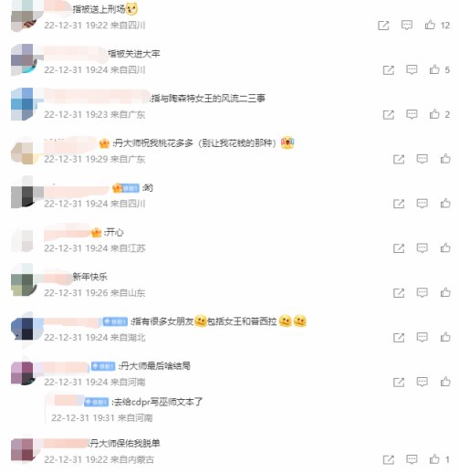 對於這樣的新年賀詞,評論區的網友自然對此進行了一番調侃,表示確實希望像丹大師一樣桃花運泛濫,但並不想被關進大牢甚至送上刑場