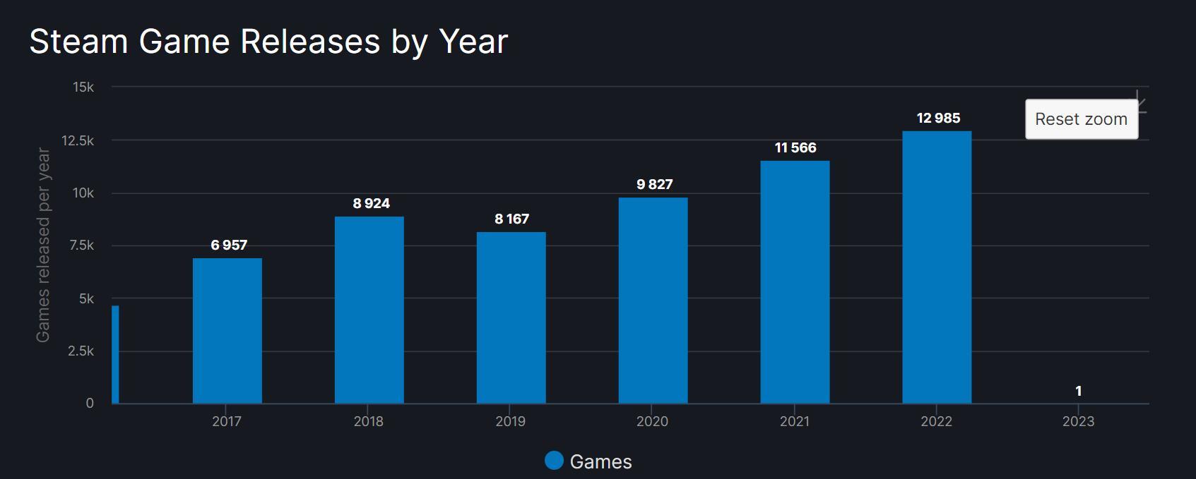 根據第三方數據平台Steamdb統計,Steam在2021年總共發布了11566款新遊戲,2022年這一數字提高為12985。