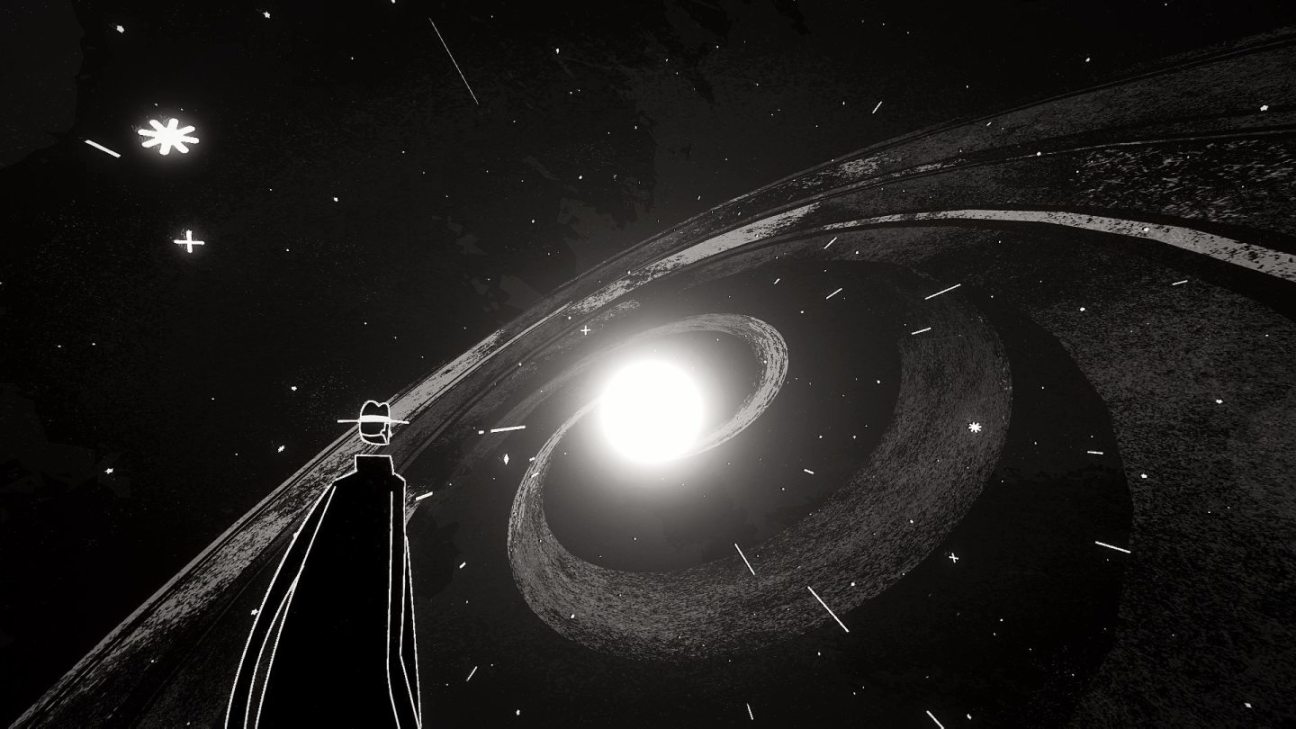 相比於游戲,《黑色起源》其實更像一部動畫電影。以白色勾勒輪廓,黑白灰為主色調的畫面,簡潔的幾何圖形組合,凸顯畫面的質感,簡練又強烈,更能欣賞出圖畫美術本身的優秀。視角的轉換配合著各種酷炫的轉場效果,2D和3D、俯仰視角的流暢切換,畫面的寬高比也在不斷改變,這就像一部復古的黑白電影。而游戲部分畫面也巧用借鑒了很多經典畫面,例如致敬愛德華霍普的《夜鷹》場景,原作那明顯的孤獨感,在夜晚被黑暗包圍,心事重重的人在酒館喝酒。孤獨的身影,長長的影子和大氣的光線,在《黑色起源》中也還原了這樣的氛圍,契合了游戲所想表達的在浩瀚的宇宙中,人們的渺小與孤獨。