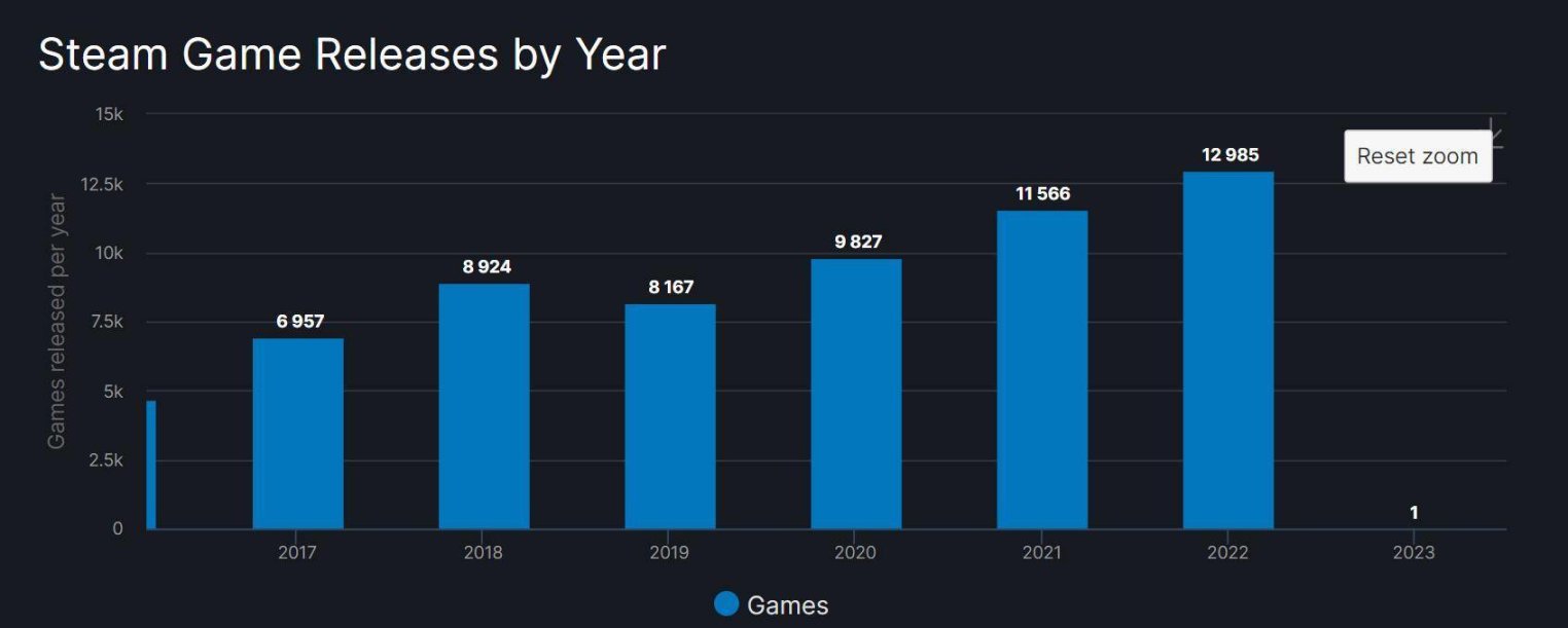 根據第三方數據平台Steamdb統計,Steam在2022年總共發布了12985款新遊戲,相比之下2021年這一數字為11566款