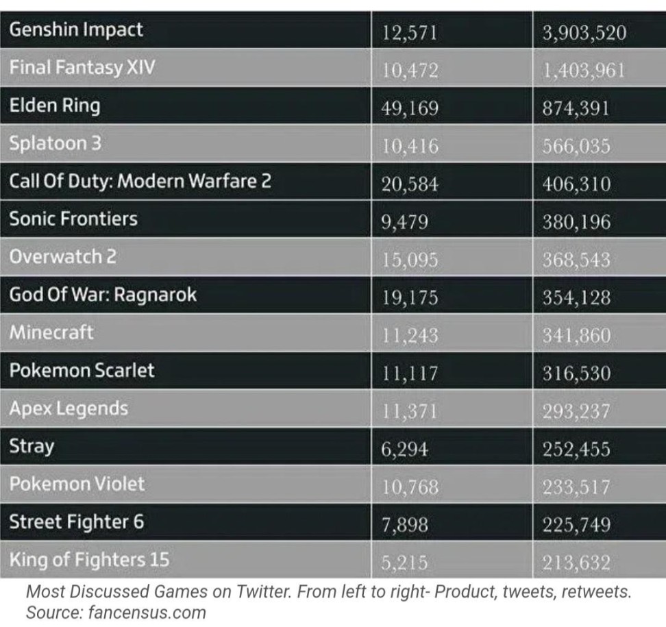 統計顯示,關於該作的推文有12571條,轉發量為3903520次。位列其後的是《最終幻想14》和《艾爾登法環》