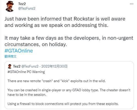 目前R星已經知曉該問題,但因為部分開發人員正在休假,因此修復將會有所耽誤。Tez2建議玩家們使用防火牆阻止連接,以此避免被惡意玩家使用該漏洞影響遊戲體驗