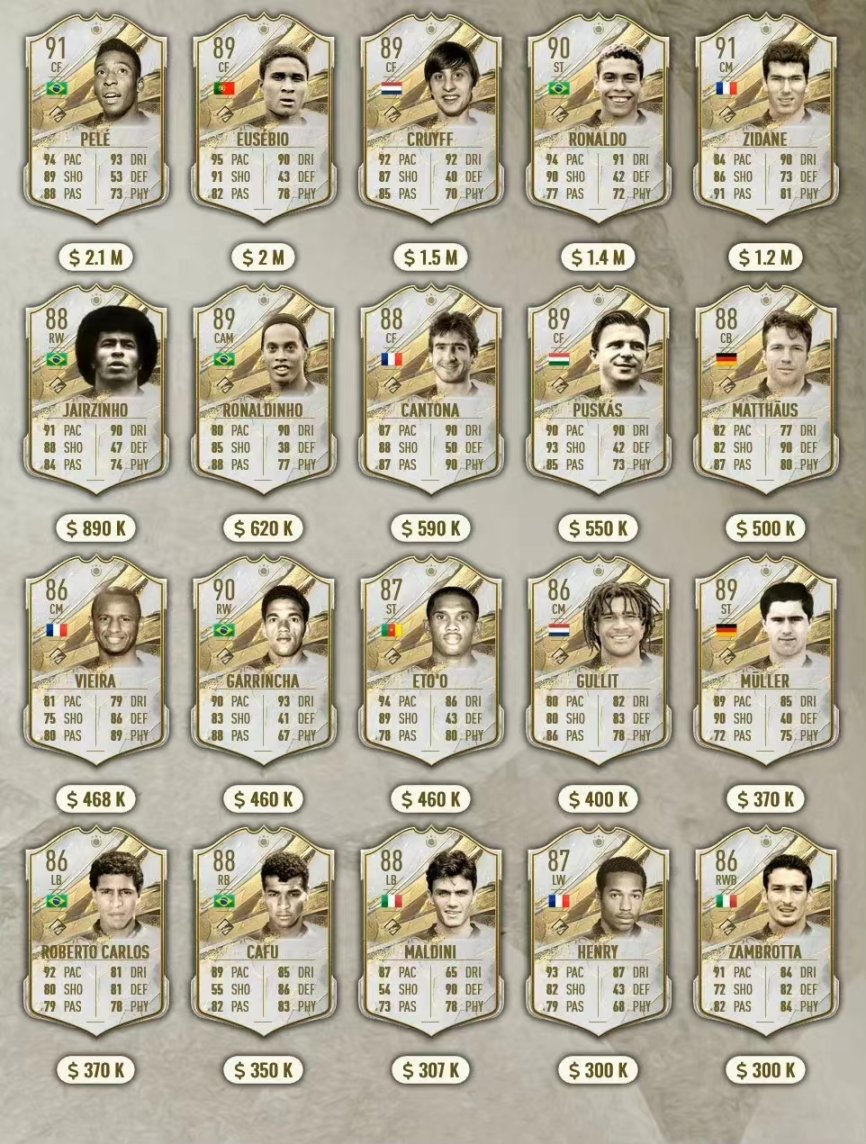 圖上是基礎傳奇卡池過300k的球員,考慮到傳奇有溢價的情況,個人認為只有開到圖上的20張才能算歐。拿我自己舉例子,我摸的是阿爾貝托,看著是二十多萬的卡,實際強度根本放不進玩了一段時間的陣容里,到最後也只能淪為獻祭卡。