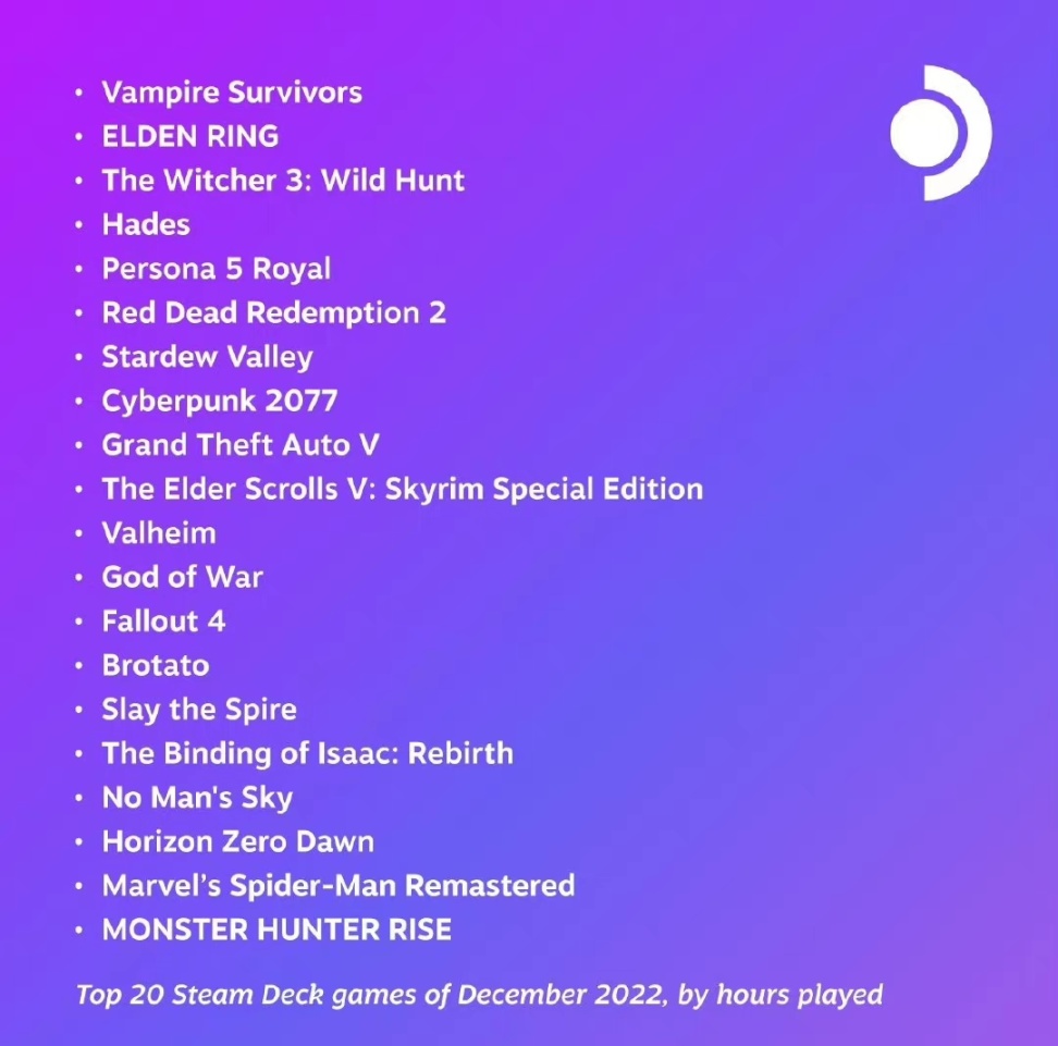 V社官方分享了Steam Deck掌機12月遊戲熱度排名(按遊戲時間排序),在《巫師3:狂獵》次世代版推出後,遊戲在掌機上也非常火爆,登上了12月榜單的第三位。