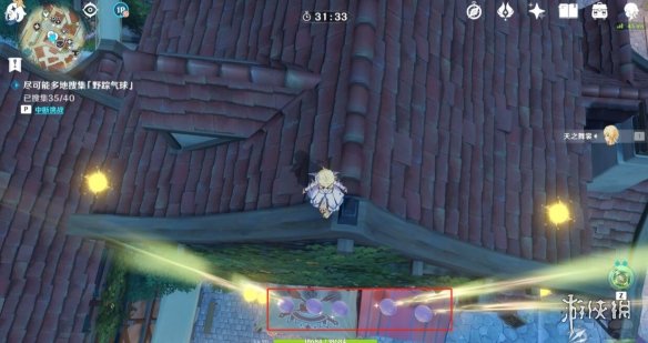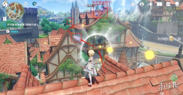 接著我們穿過加速風場到對面屋頂拾取3個紫球,再跟著紅色路線指示去撿橙色的球。