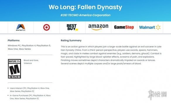 《仁王》系列團隊Team NINJA開發的暗黑三國誅死遊戲《卧龍:蒼天隕落(Wo Long: Fallen Dynasty)》現已通過娛樂軟體分級委員會(ESRB)的「Mature 17+」評級,包含血腥、暴力、用戶交互和遊戲內購等內容。