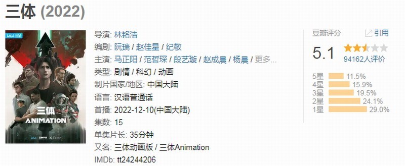 《三體》動畫已更新至第5集,目前其豆瓣評分已跌至5.1分,給出1星的有29%之多,其次是2星有24.1%,5星僅有11.5%。不少網友認為該動畫的人物塑造與劇情結構出現問題,還有人反映劇情毫無深度、人設崩塌、台詞尷尬且僵硬等等。