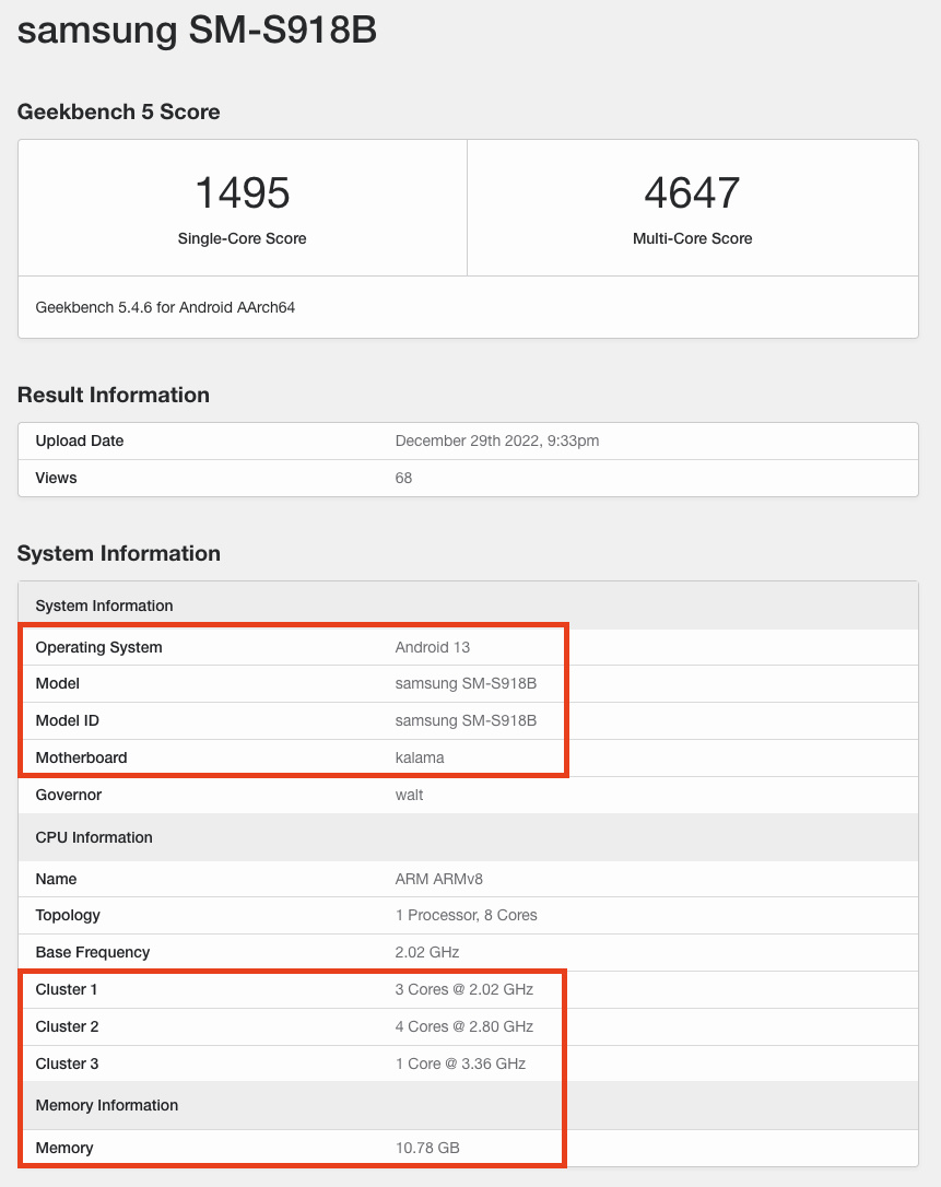 最高端的 Galaxy S23 Ultra 版本已經出現在 Geekbench 的資料庫中,證實其將配備 12GB 內存。該機搭載驍龍 8 Gen 2 晶元組,運行Android 13。其在單核 CPU 性能測試中得到 1,495 分,在多核 CPU 性能測試中得到 4,647 分。從該手機的多核得分來看,其得分低於其它配備了驍龍 8 Gen 2 的手機。