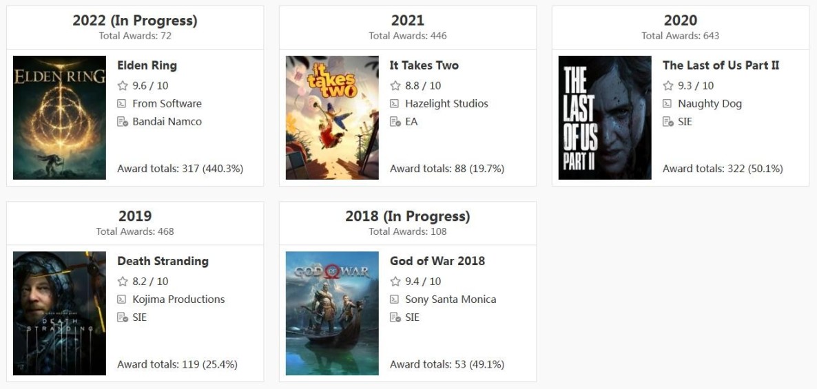 根據數據統計網站goty.gamefa公布的信息顯示:《艾爾登法環》獲獎數量馬上就要超過《最後生還者2》,成為有史以來獲獎最多的遊戲作品